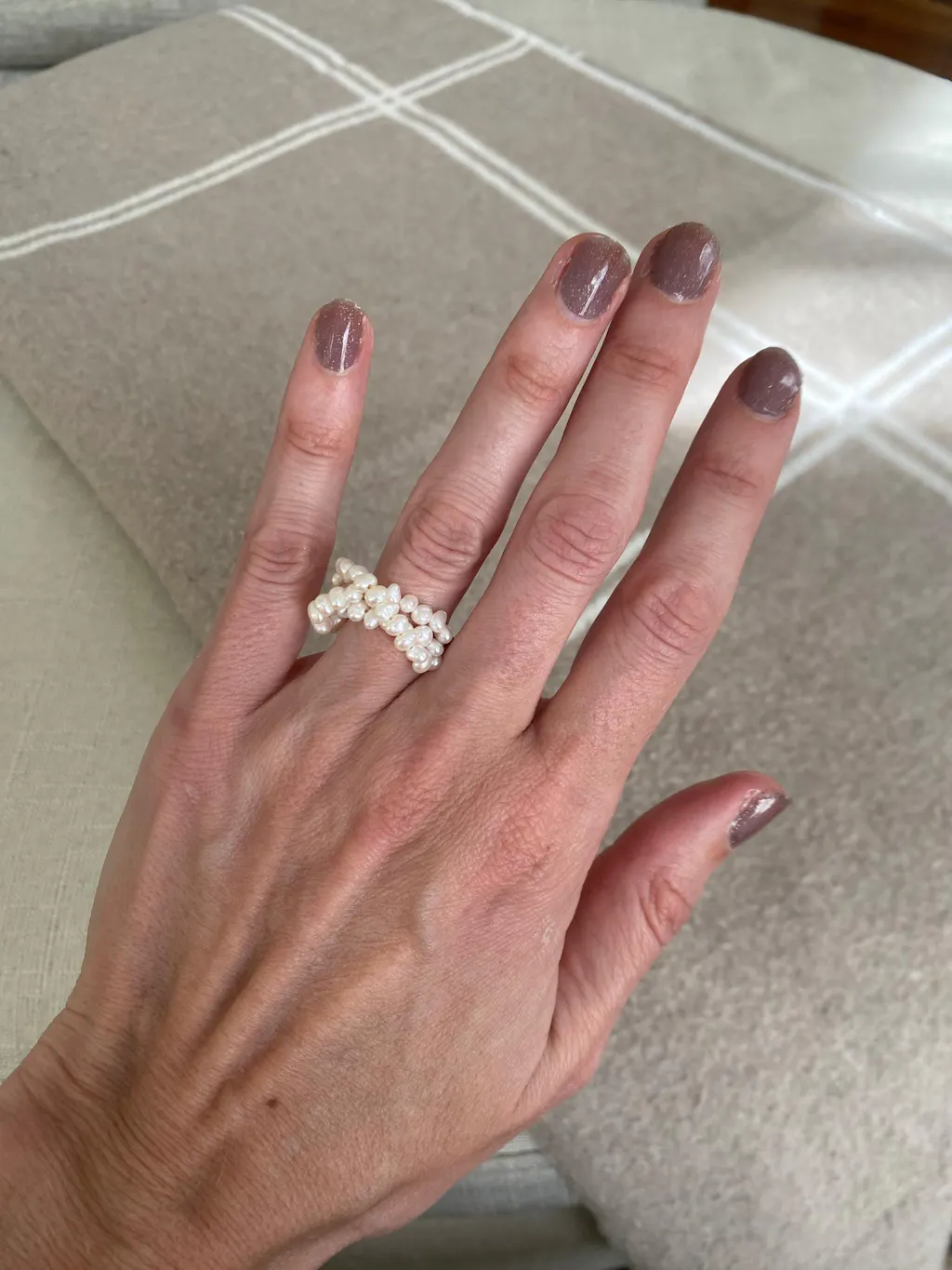 A chunky 14k gold freshwater pearl ring featuring three strands of dainty baby pearls strung across a hammered gold-plated half band. Modern, stackable, and wearable every day, this pearl ring makes a beautiful gift for brides, June birthdays, or anniversaries.